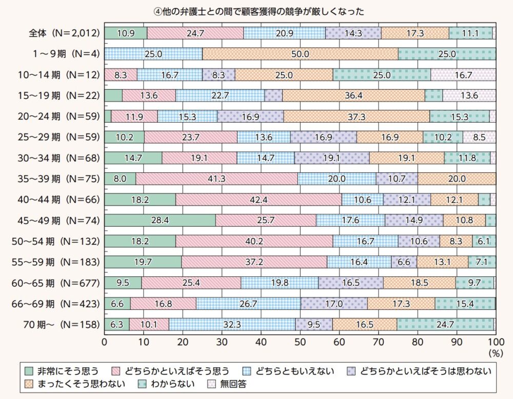 上記の表より、多くの弁護士が10年前と比較して、他の弁護士との競争が厳しくなっていると感じていることが分かります。特に40〜59期では、「非常にそう思う」・「どちらかといえばそう思う」と回答した方が半数を超えています。